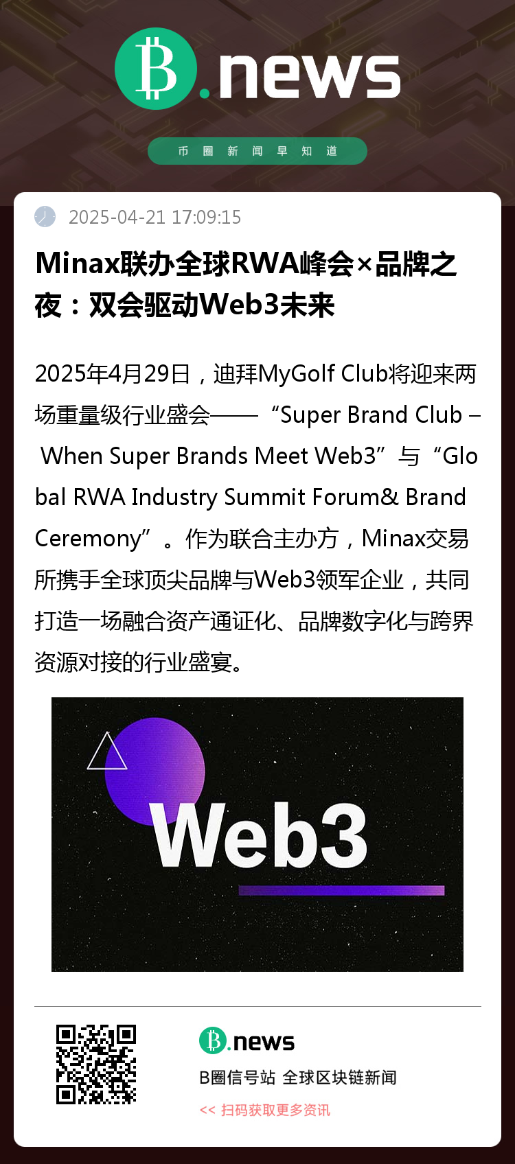 2025年4月29日,迪拜MyGolf Club将迎来两场重量级行业盛会——“Super Brand Club – When Super Brands Meet Web3”与“Global RWA Industry Summit Forum& Brand Ceremony”。作为联合主办方,Minax交易所携手全球顶尖品牌与Web3领军企业,共同打造一场融合资产通证化、品牌数字化与跨界资源对接的行业盛宴。