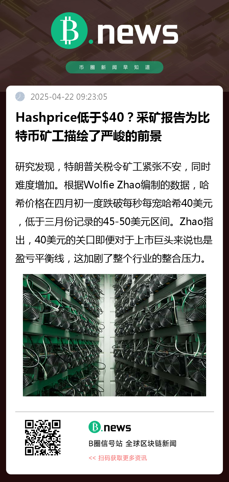 根据Wolfie Zhao编制的数据,哈希价格在四月初一度跌破每秒每宠哈希40美元,低于三月份记录的45-50美元区间。Zhao指出,40美元的关口即便对于上市巨头来说也是盈亏平衡线,这加剧了整个行业的整合压力。