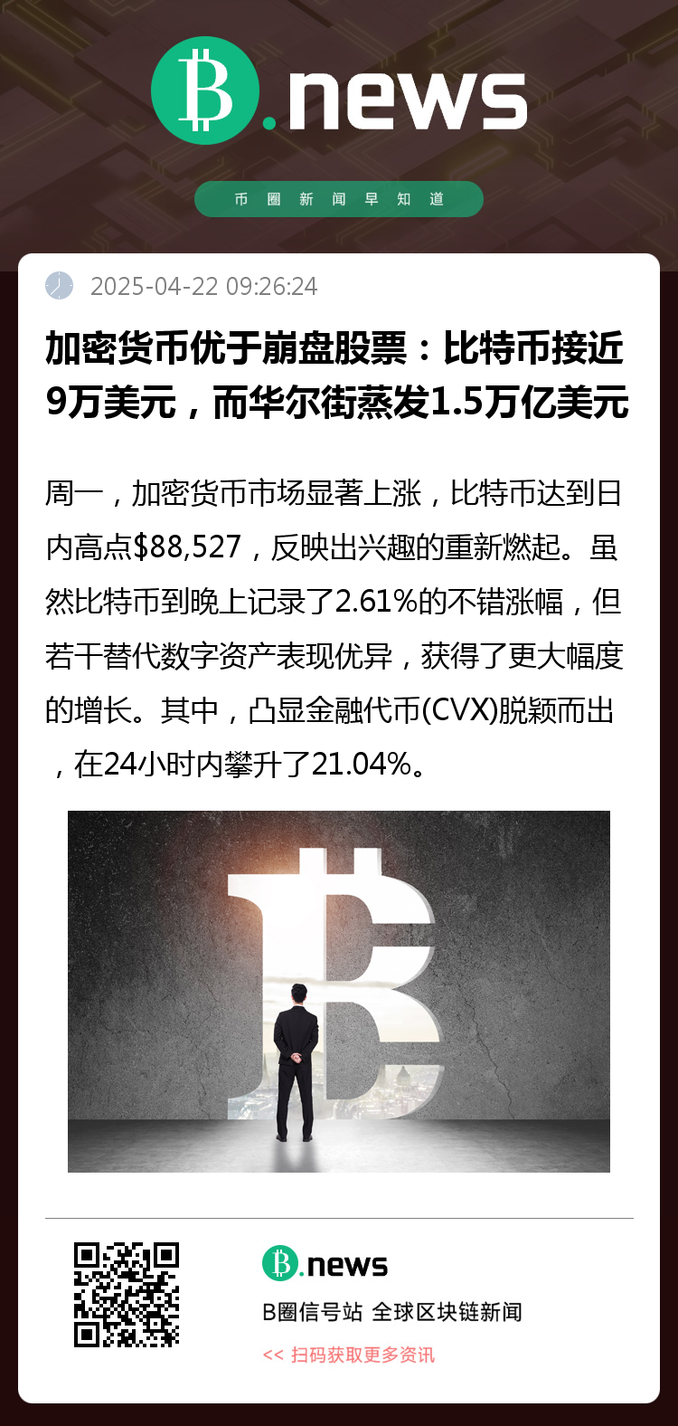 周一,加密货币市场显著上涨,比特币达到日内高点$88,527,反映出兴趣的重新燃起。虽然比特币到晚上记录了2.61%的不错涨幅,但若干替代数字资产表现优异,获得了更大幅度的增长。其中,凸显金融代币(CVX)脱颖而出,在24小时内攀升了21.04%。