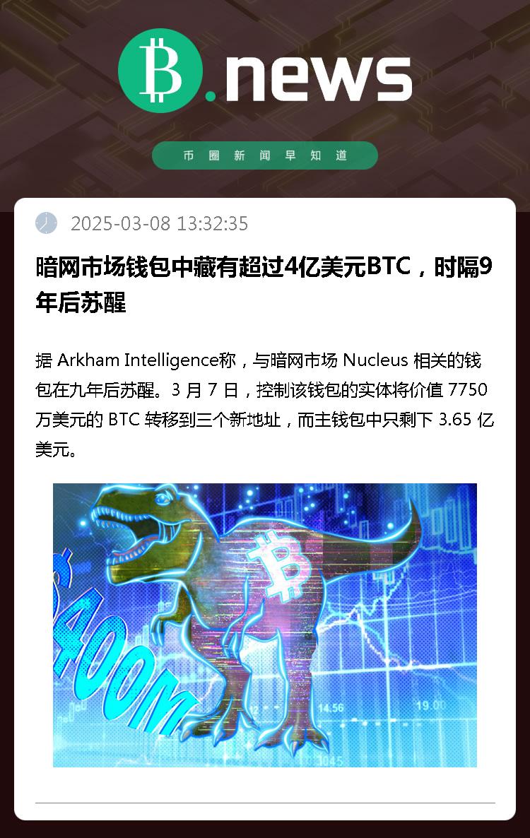 据 Arkham Intelligence称,与暗网市场 Nucleus 相关的钱包在九年后苏醒。3 月 7 日,控制该钱包的实体将价值 7750 万美元的 BTC 转移到三个新地址,而主钱包中只剩下 3.65 亿美元。