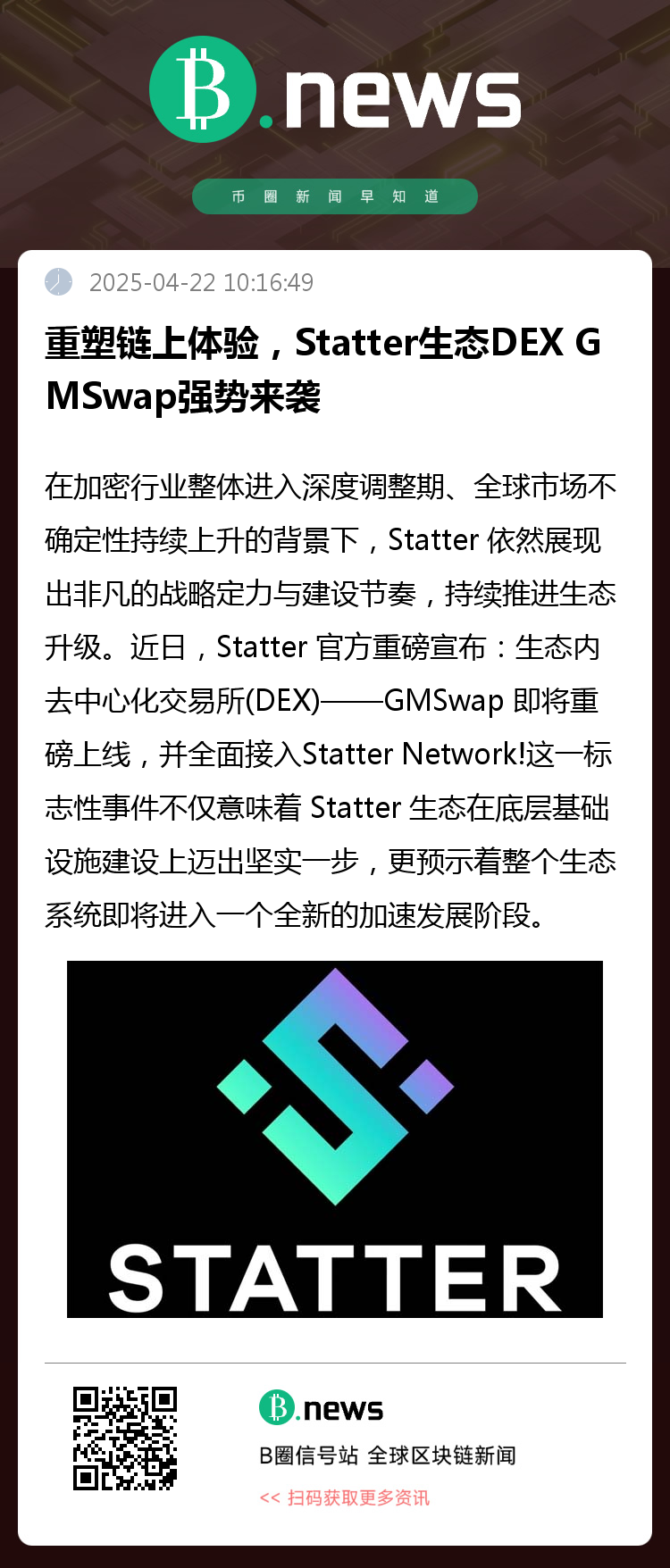 在加密行业整体进入深度调整期、全球市场不确定性持续上升的背景下,Statter 依然展现出非凡的战略定力与建设节奏,持续推进生态升级。近日,Statter 官方重磅宣布:生态内去中心化交易所(DEX)——GMSwap 即将重磅上线,并全面接入Statter Network!这一标志性事件不仅意味着 Statter 生态在底层基础设施建设上迈出坚实一步,更预示着整个生态系统即将进入一个全新的加速发展阶段。