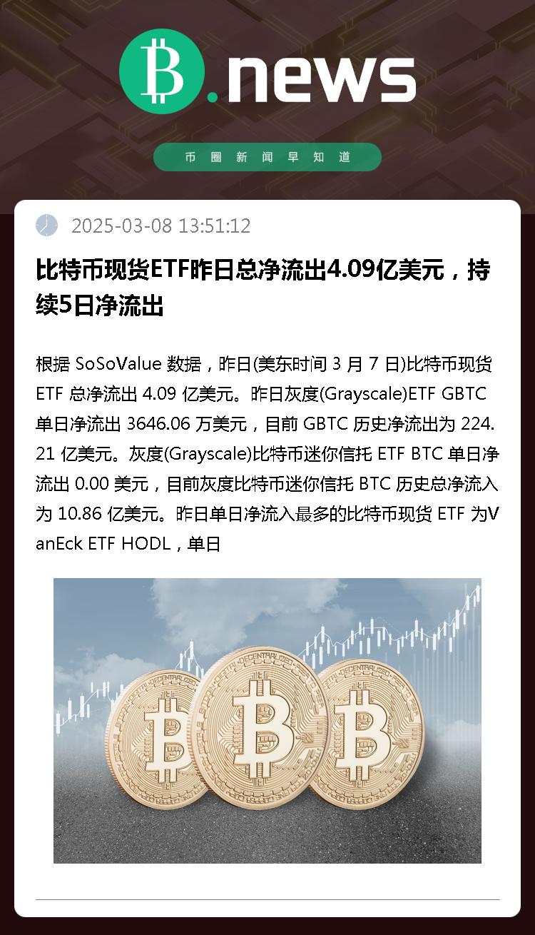 根据 SoSoValue 数据,昨日(美东时间 3 月 7 日)比特币现货 ETF 总净流出 4.09 亿美元。