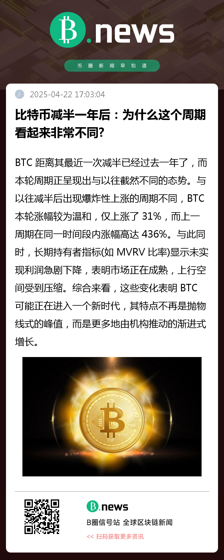 BTC 距离其最近一次减半已经过去一年了,而本轮周期正呈现出与以往截然不同的态势。与以往减半后出现爆炸性上涨的周期不同,BTC 本轮涨幅较为温和,仅上涨了 31%,而上一周期在同一时间段内涨幅高达 436%。