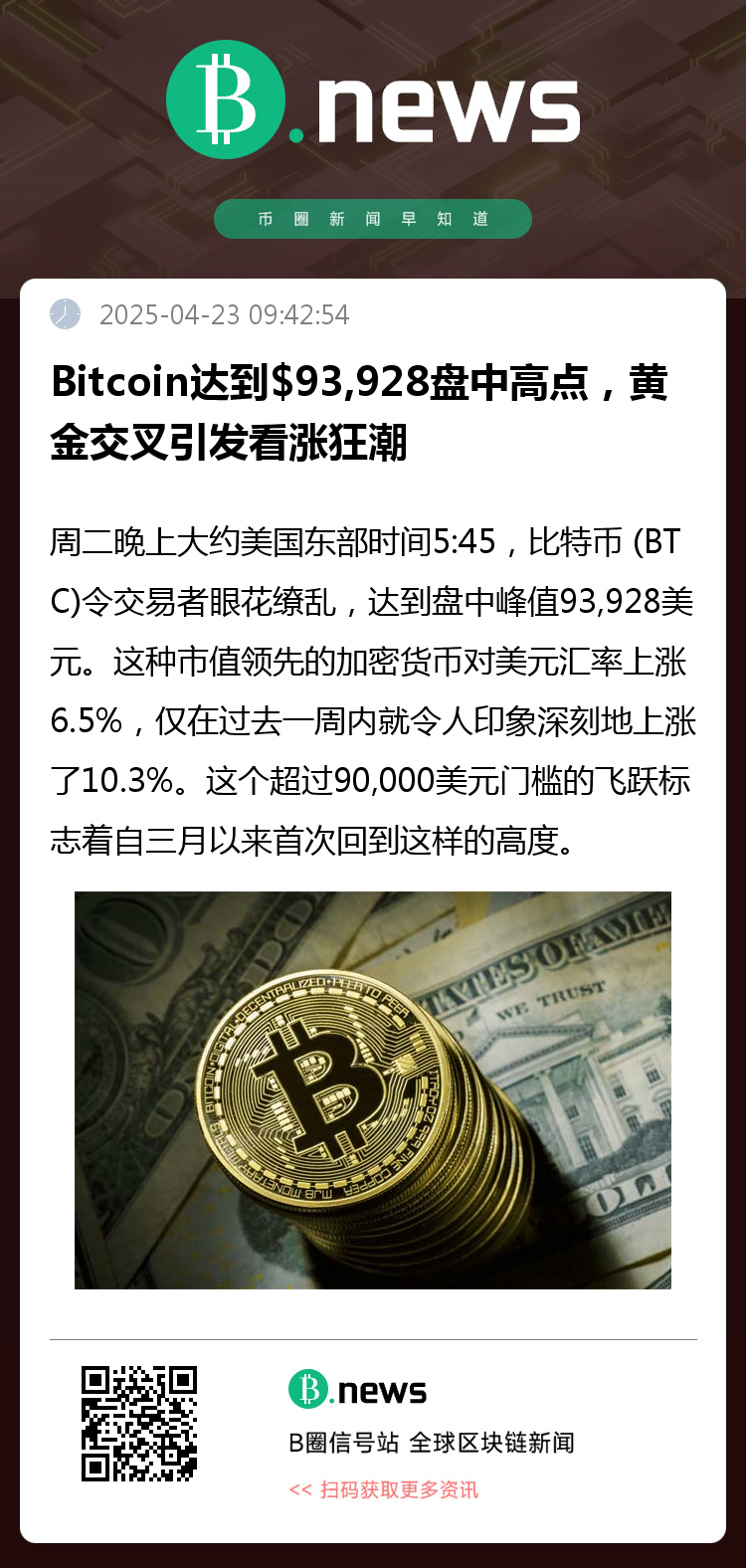 周二晚上大约美国东部时间5:45,比特币 (BTC)令交易者眼花缭乱,达到盘中峰值93,928美元。这种市值领先的加密货币对美元汇率上涨6.5%,仅在过去一周内就令人印象深刻地上涨了10.3%。这个超过90,000美元门槛的飞跃标志着自三月以来首次回到这样的高度。该加密资产的图表现已闪耀着看涨信号:比特币不仅跳跃过重要的移动平均线 (MAs),还在其轨迹上刻下了“金叉”——一贯暗示着上升动能的经典前兆。