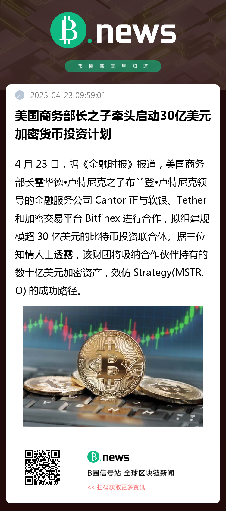 4 月 23 日,据《金融时报》报道,美国商务部长霍华德•卢特尼克之子布兰登•卢特尼克领导的金融服务公司 Cantor 正与软银、Tether 和加密交易平台 Bitfinex 进行合作,拟组建规模超 30 亿美元的比特币投资联合体。