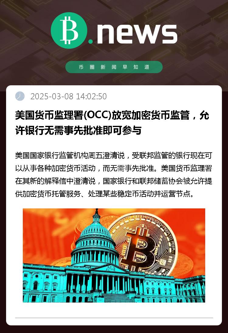 美国货币监理署还删除了美国监管机构警告银行不要涉足加密货币领域的联合声明。2023 年的一份声明并未禁止加密货币业务,但警告称,该行业波动性极大,银行的任何加密货币相关活动都将受到严格审查。
