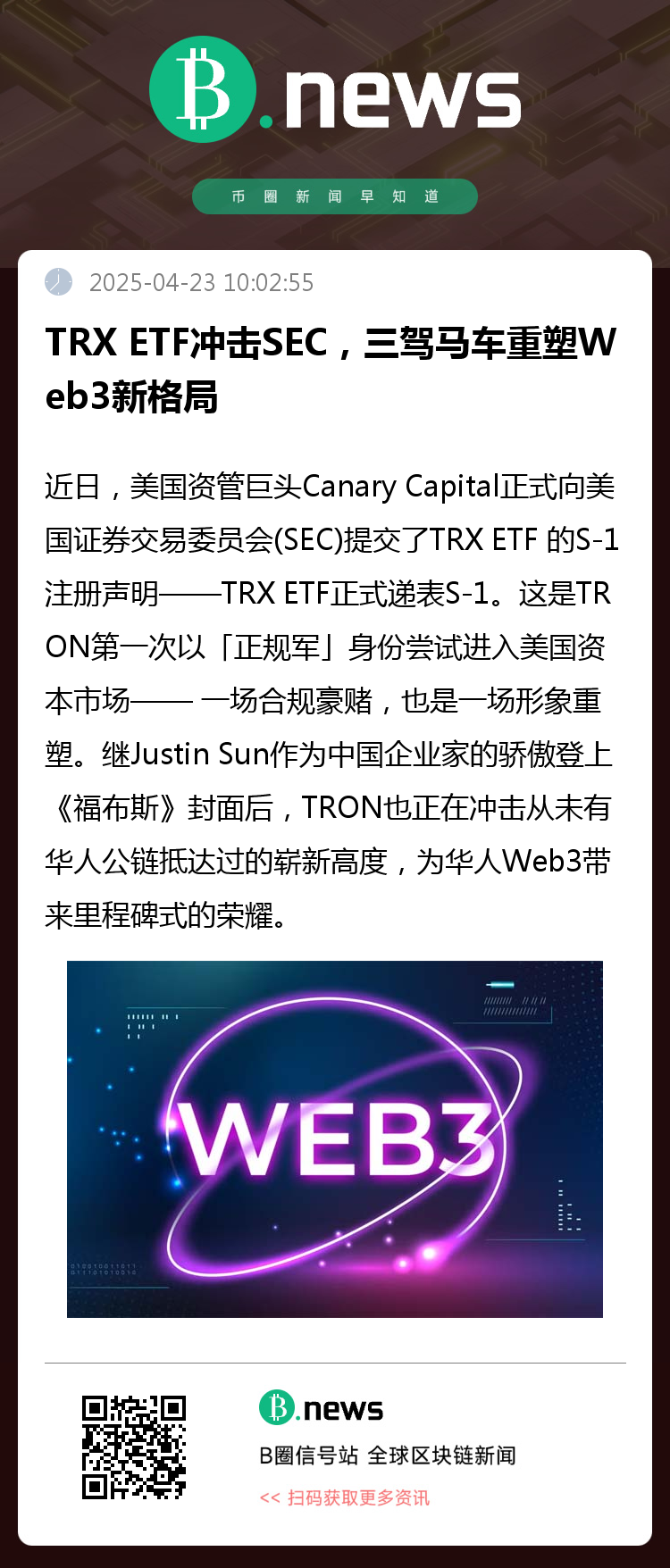 TRX ETF 的 S-1 注册申请,是华人公链冲击全球金融市场的历史性一步,也是 Justin Sun「三驾马车」撬动「不可能三角」的高光时刻。一旦 TRX ETF 成功落地,Justin Sun 让「让全世界八十亿人实现金融自由」的愿景,或许不再只是一个口号,而是一场真正照进现实的梦想。