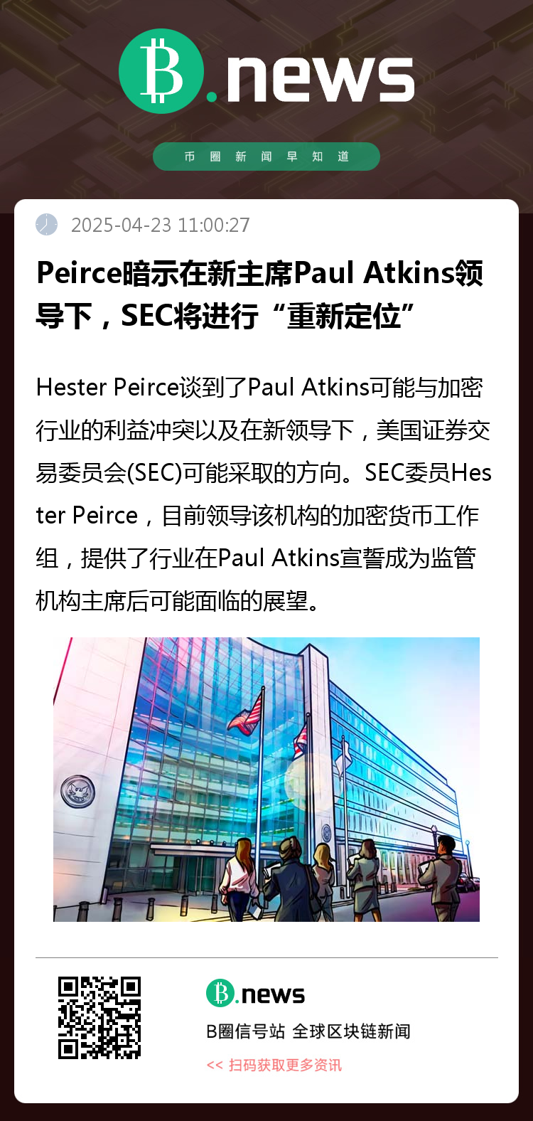 SEC委员Hester Peirce,目前领导该机构的加密货币工作组,提供了行业在Paul Atkins宣誓成为监管机构主席后可能面临的展望。