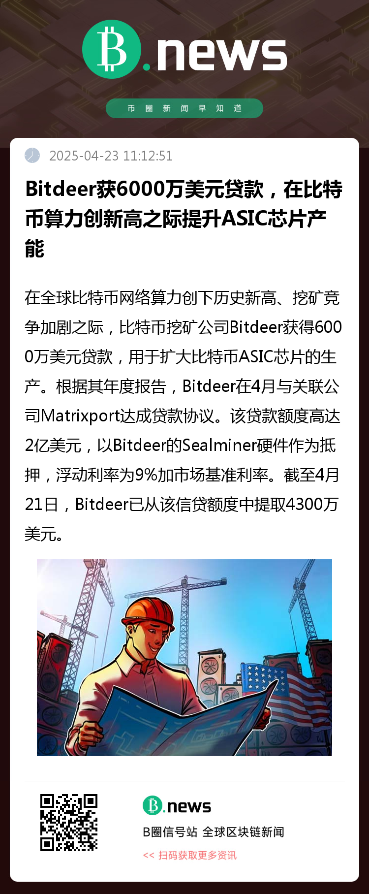 在全球比特币网络算力创下历史新高、挖矿竞争加剧之际,比特币挖矿公司Bitdeer获得6000万美元贷款,用于扩大比特币ASIC芯片的生产。