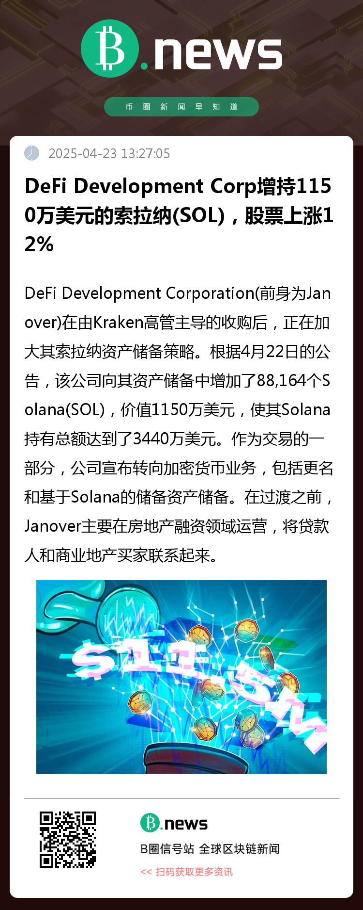 4月7日,DeFi Development Corporation被一组前Kraken高管收购。作为交易的一部分,公司宣布转向加密货币业务,包括更名和基于Solana的储备资产储备。在过渡之前,Janover主要在房地产融资领域运营,将贷款人和商业地产买家联系起来。