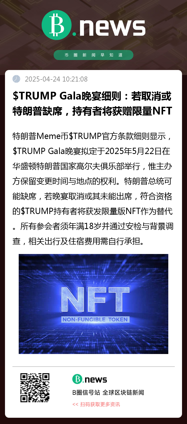特朗普Meme币$TRUMP官方条款细则显示,$TRUMP Gala晚宴拟定于2025年5月22日在华盛顿特朗普国家高尔夫俱乐部举行,惟主办方保留变更时间与地点的权利。特朗普总统可能缺席,若晚宴取消或其未能出席,符合资格的$TRUMP持有者将获发限量版NFT作为替代。所有参会者须年满18岁并通过安检与背景调查,相关出行及住宿费用需自行承担。