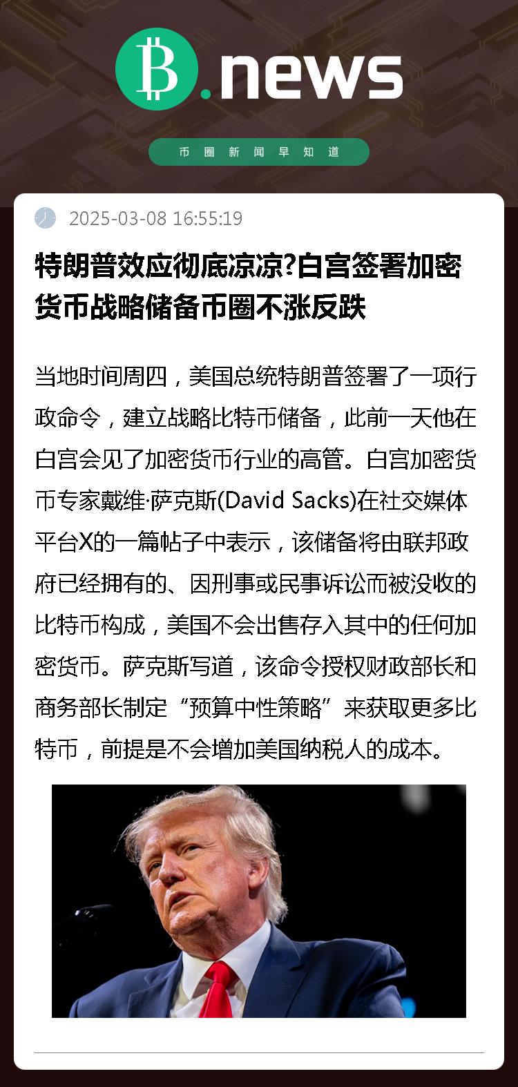 当地时间周四,美国总统特朗普签署了一项行政命令,建立战略比特币储备,此前一天他在白宫会见了加密货币行业的高管。
