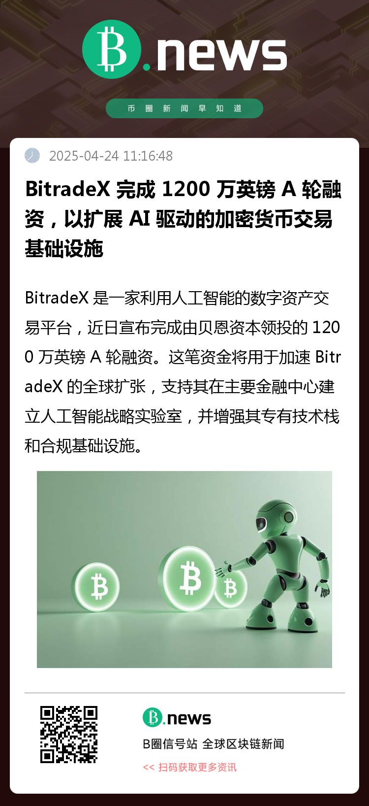 BitradeX 是一家利用人工智能的数字资产交易平台,近日宣布完成由贝恩资本领投的 1200 万英镑 A 轮融资。这笔资金将用于加速 BitradeX 的全球扩张,支持其在主要金融中心建立人工智能战略实验室,并增强其专有技术栈和合规基础设施。