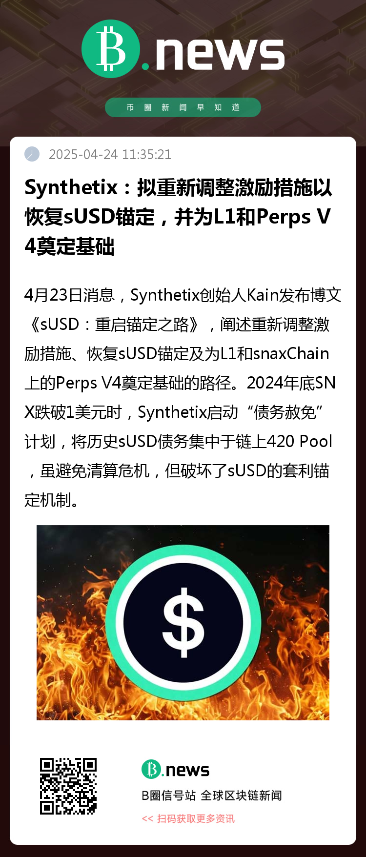 4月23日消息,Synthetix创始人Kain发布博文《sUSD:重启锚定之路》,阐述重新调整激励措施、恢复sUSD锚定及为L1和snaxChain上的Perps V4奠定基础的路径。2024年底SNX跌破1美元时,Synthetix启动“债务赦免”计划,将历史sUSD债务集中于链上420 Pool,虽避免清算危机,但破坏了sUSD的套利锚定机制。为将sUSD恢复至1美元,需重新引入激励措施:正向激励为质押sUSD到420 Pool可获SNX通胀奖励;负向激励要求质押者存入一定比例的sUSD(初始为未偿债务的5 - 10%),未达标则暂停债务免除,且锚定偏离时比例上调。同时,优化质押模型,实施SNX池化质押,创建新420 Pool接纳新抵押资产,扩大sUSD供应且无清算风险,初期包括USDC,后续可拓展至其他DeFi代币。