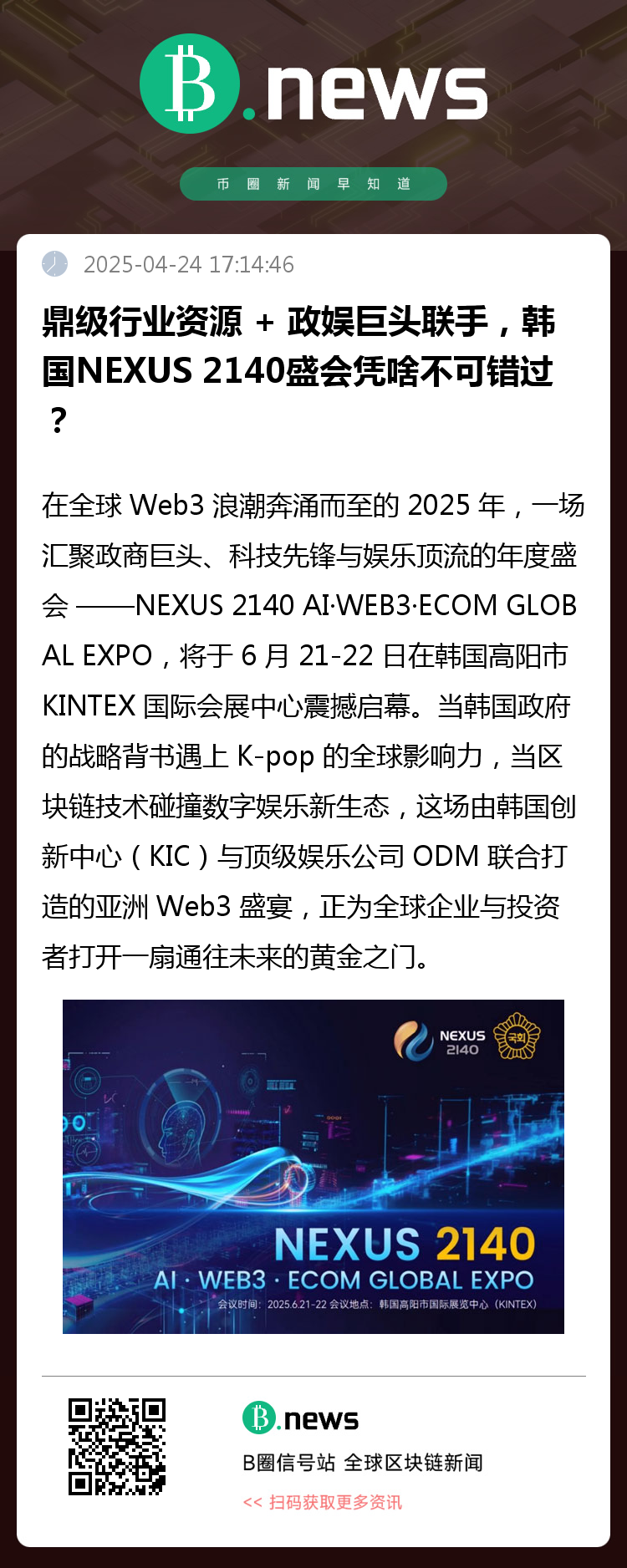 在全球 Web3 浪潮奔涌而至的 2025 年,一场汇聚政商巨头、科技先锋与娱乐顶流的年度盛会 ——NEXUS 2140 AI·WEB3·ECOM GLOBAL EXPO,将于 6 月 21-22 日在韩国高阳市 KINTEX 国际会展中心震撼启幕。当韩国政府的战略背书遇上 K-pop 的全球影响力,当区块链技术碰撞数字娱乐新生态,这场由韩国创新中心(KIC)与顶级娱乐公司 ODM 联合打造的亚洲 Web3 盛宴,正为全球企业与投资者打开一扇通往未来的黄金之门。