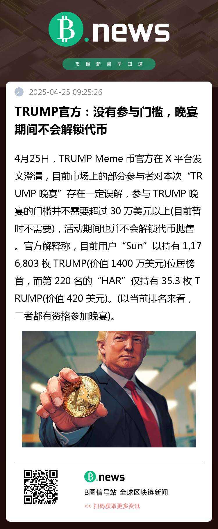 4 月 25 日,TRUMP Meme 币官方在 X 平台发文澄清,目前市场上的部分参与者对本次“TRUMP 晚宴”存在一定误解,参与 TRUMP 晚宴的门槛并不需要超过 30 万美元以上(目前暂时不需要),活动期间也并不会解锁代币抛售。