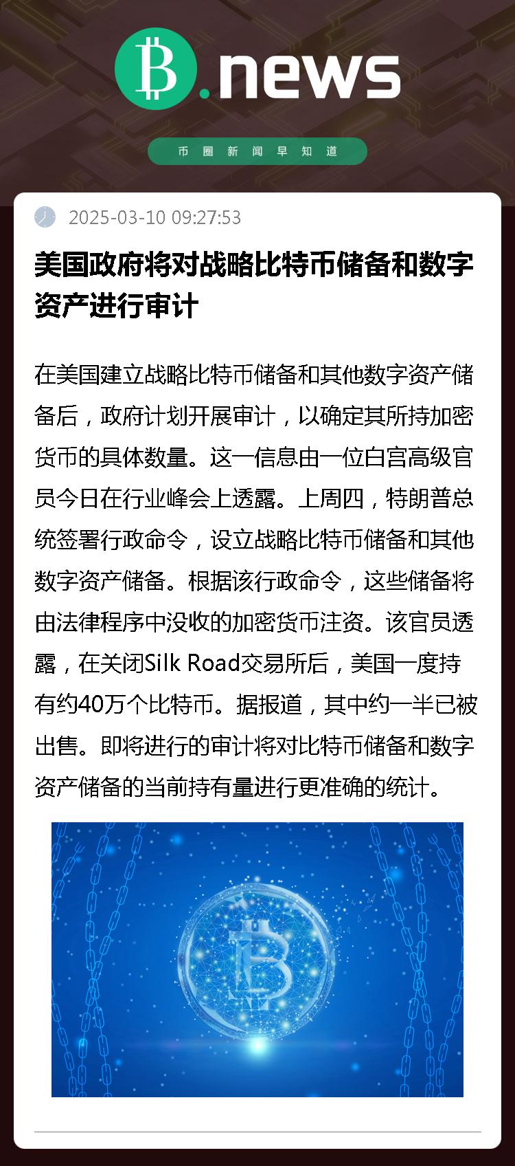 该官员透露,在关闭Silk Road交易所后,美国一度持有约40万个比特币。据报道,其中约一半已被出售。即将进行的审计将对比特币储备和数字资产储备的当前持有量进行更准确的统计。
