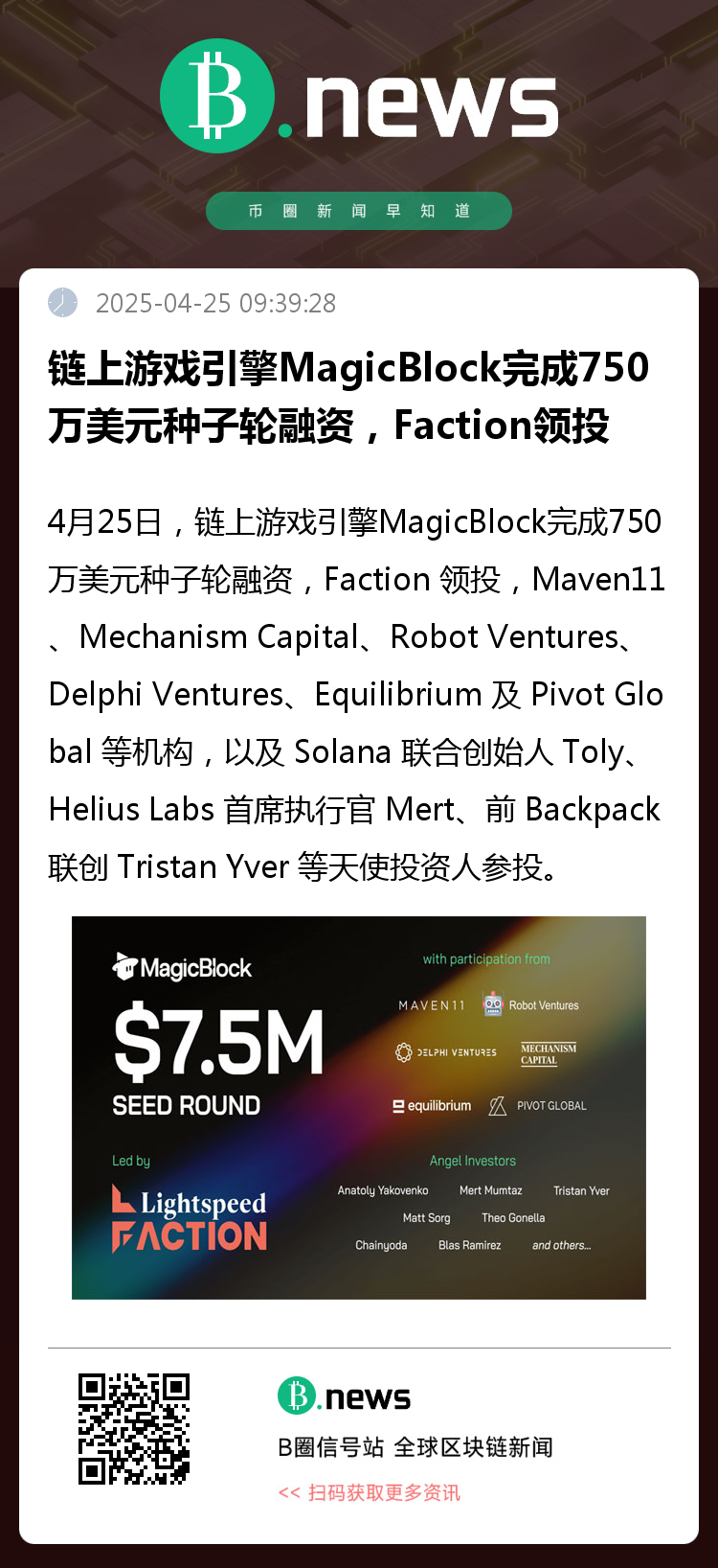 4 月 25 日,链上游戏引擎 MagicBlock 完成 750 万美元种子轮融资,Faction 领投,Maven11、Mechanism Capital、Robot Ventures、Delphi Ventures、Equilibrium 及 Pivot Global 等机构,以及 Solana 联合创始人 Toly、Helius Labs 首席执行官 Mert、前 Backpack 联创 Tristan Yver 等天使投资人参投。
