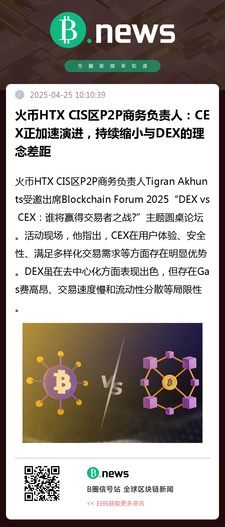 火币HTX CIS区P2P商务负责人Tigran Akhunts受邀出席Blockchain Forum 2025“DEX vs CEX:谁将赢得交易者之战?”主题圆桌论坛。活动现场,他指出,CEX在用户体验、安全性、满足多样化交易需求等方面存在明显优势。DEX虽在去中心化方面表现出色,但存在Gas费高昂、交易速度慢和流动性分散等局限性。他认为,CEX与DEX并非零和博弈,而是各自服务于不同的用户需求共同存在。