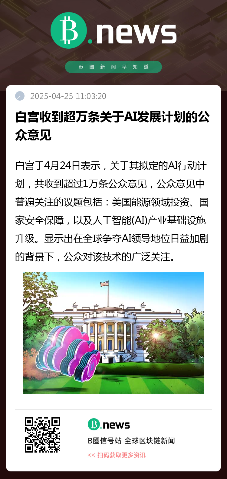 白宫于4月24日表示,关于其拟定的AI行动计划,共收到超过1万条公众意见,显示出在全球争夺AI领导地位日益加剧的背景下,公众对该技术的广泛关注。