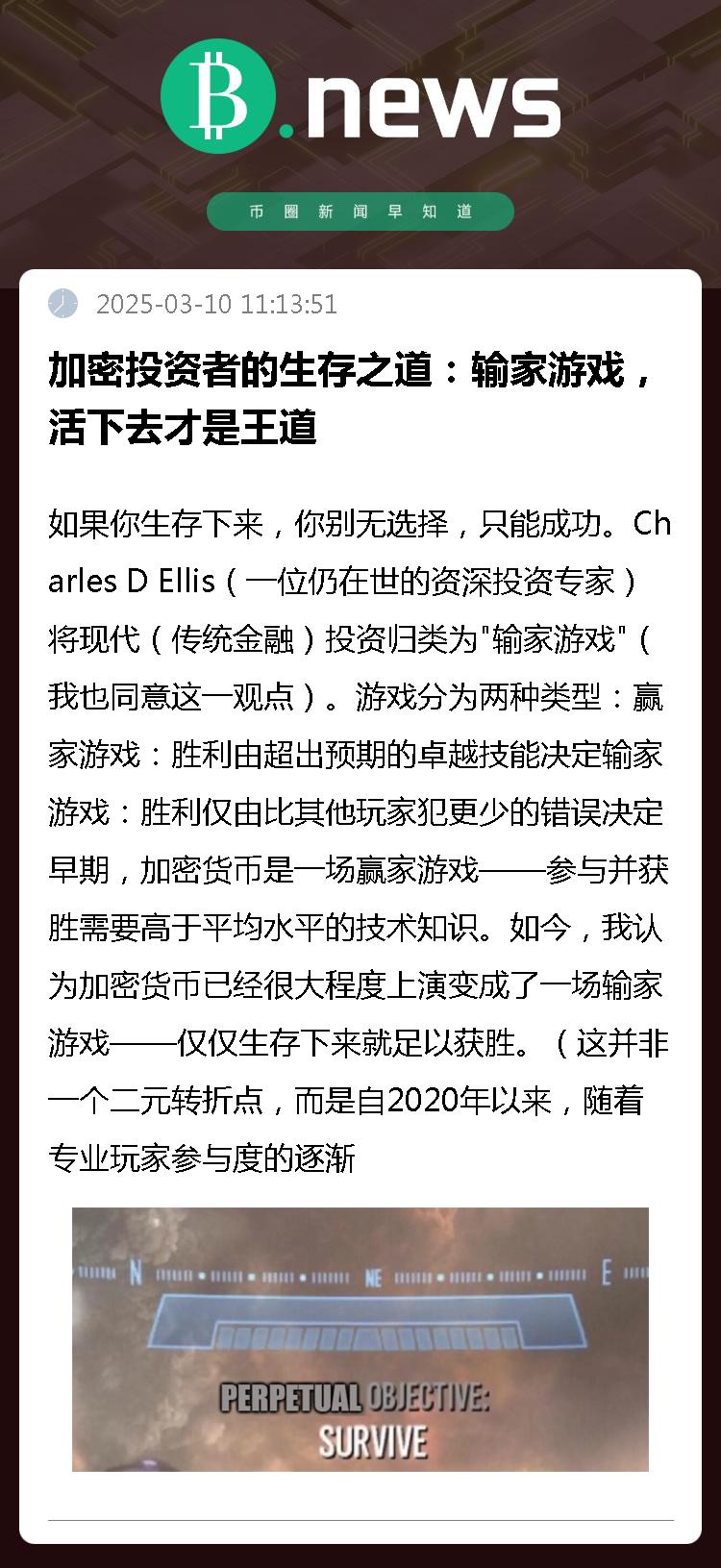 如今,我认为加密货币已经很大程度上演变成了一场输家游戏——仅仅生存下来就足以获胜。