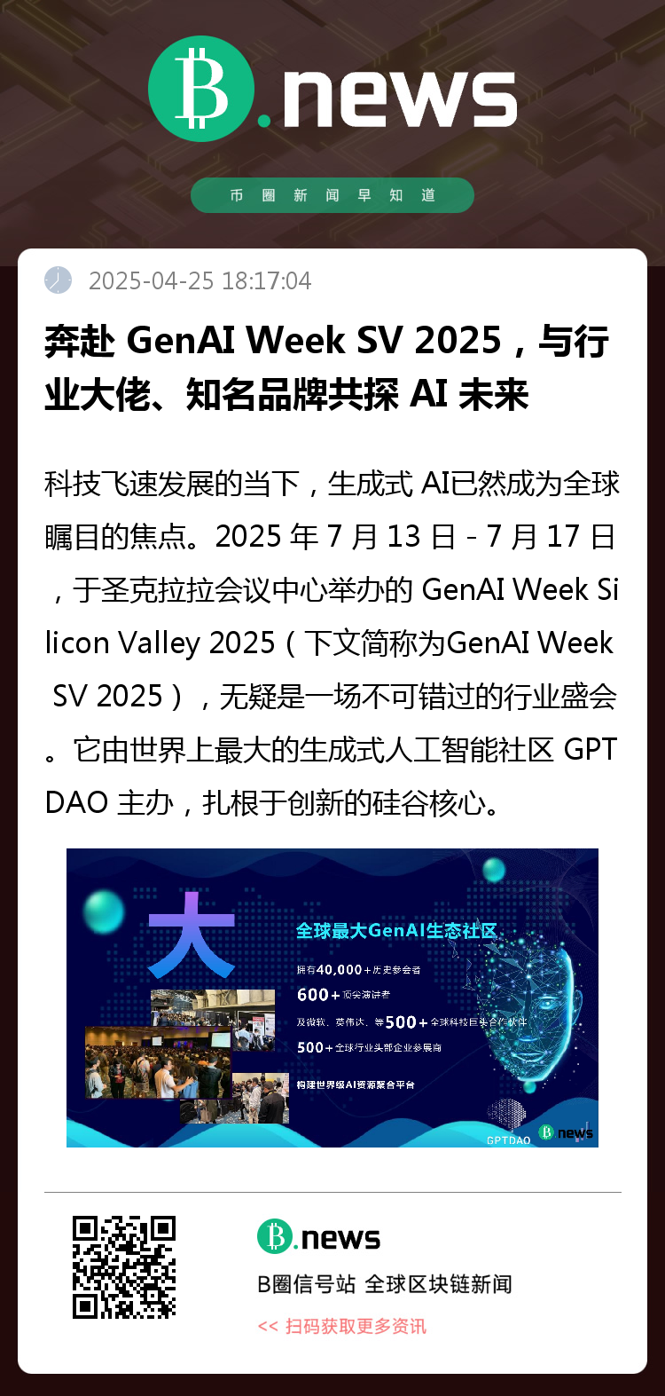 如果您渴望在生成式 AI 领域开拓新局、提升品牌影响力、获取前沿资讯,那就不要错过 GenAI Week SV 2025。基于 GPTDAO 的权威招商授权,B.news 已全面开启 Gen AI Week 招商之旅。现诚邀您共赴盛会,解锁前沿商机,限量门票火热开售,速来抢占席位!