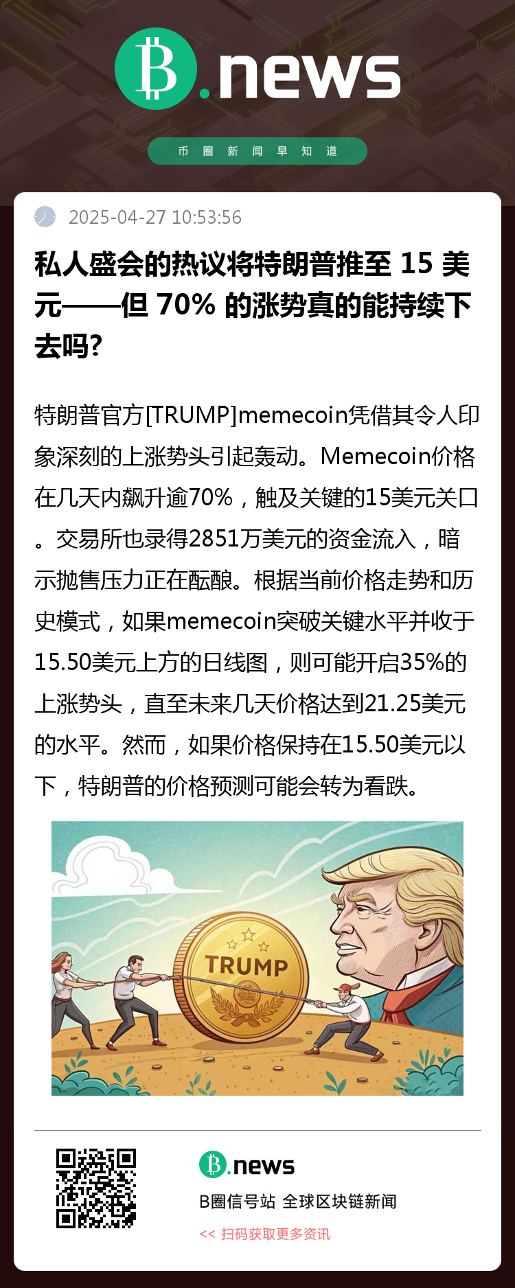 该声明原定于5月22日发布,引发市场突破多个阻力位。截至发稿时,特朗普的股价徘徊在15美元附近,过去24小时内上涨了16.10%。