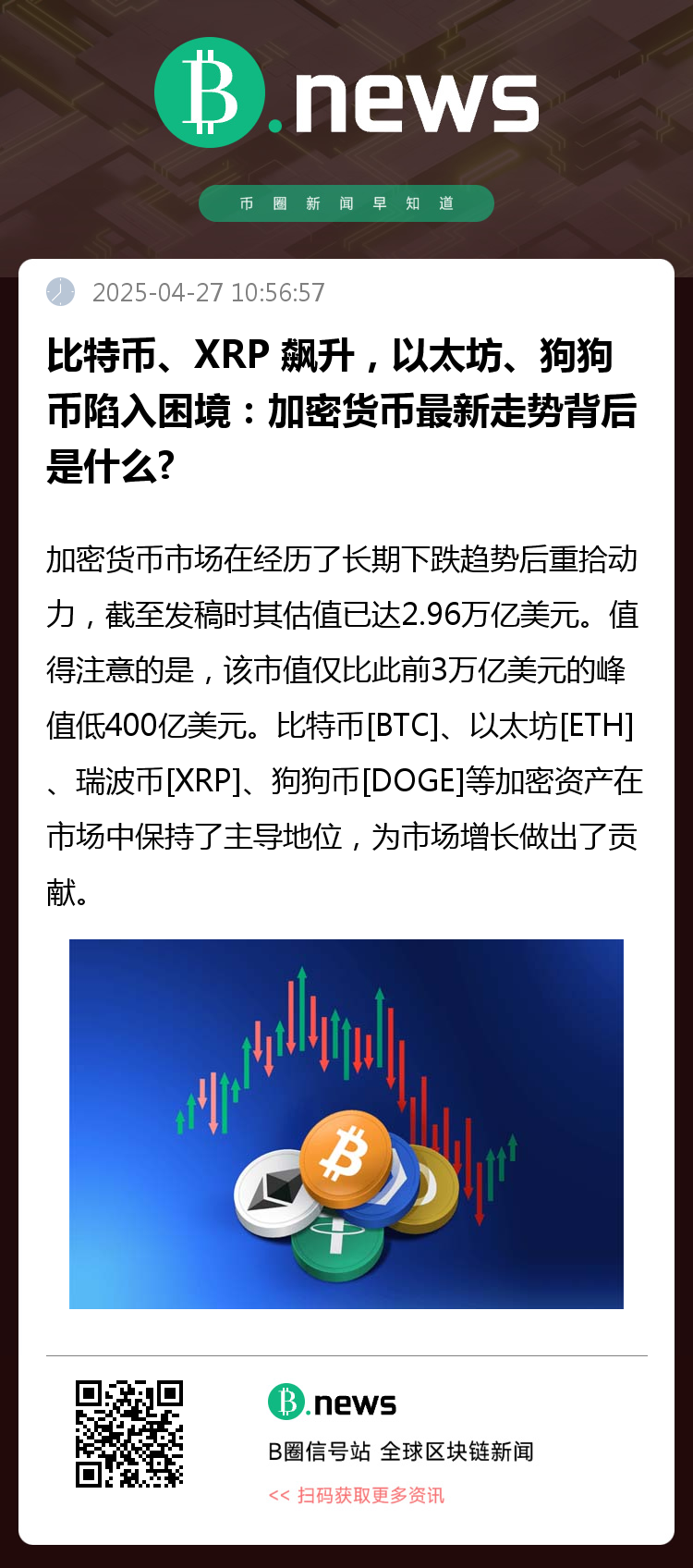 加密货币市场在经历了长期下跌趋势后重拾动力,截至发稿时其估值已达2.96万亿美元。值得注意的是,该市值仅比此前3万亿美元的峰值低400亿美元。