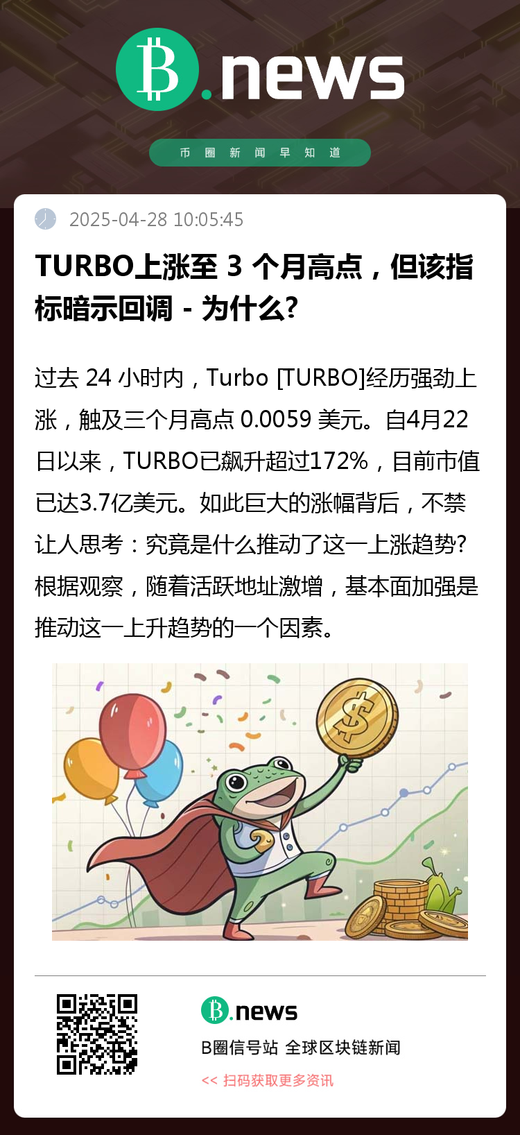 自4月22日以来,TURBO已飙升超过172%,目前市值已达3.7亿美元。如此巨大的涨幅背后,不禁让人思考:究竟是什么推动了这一上涨趋势?