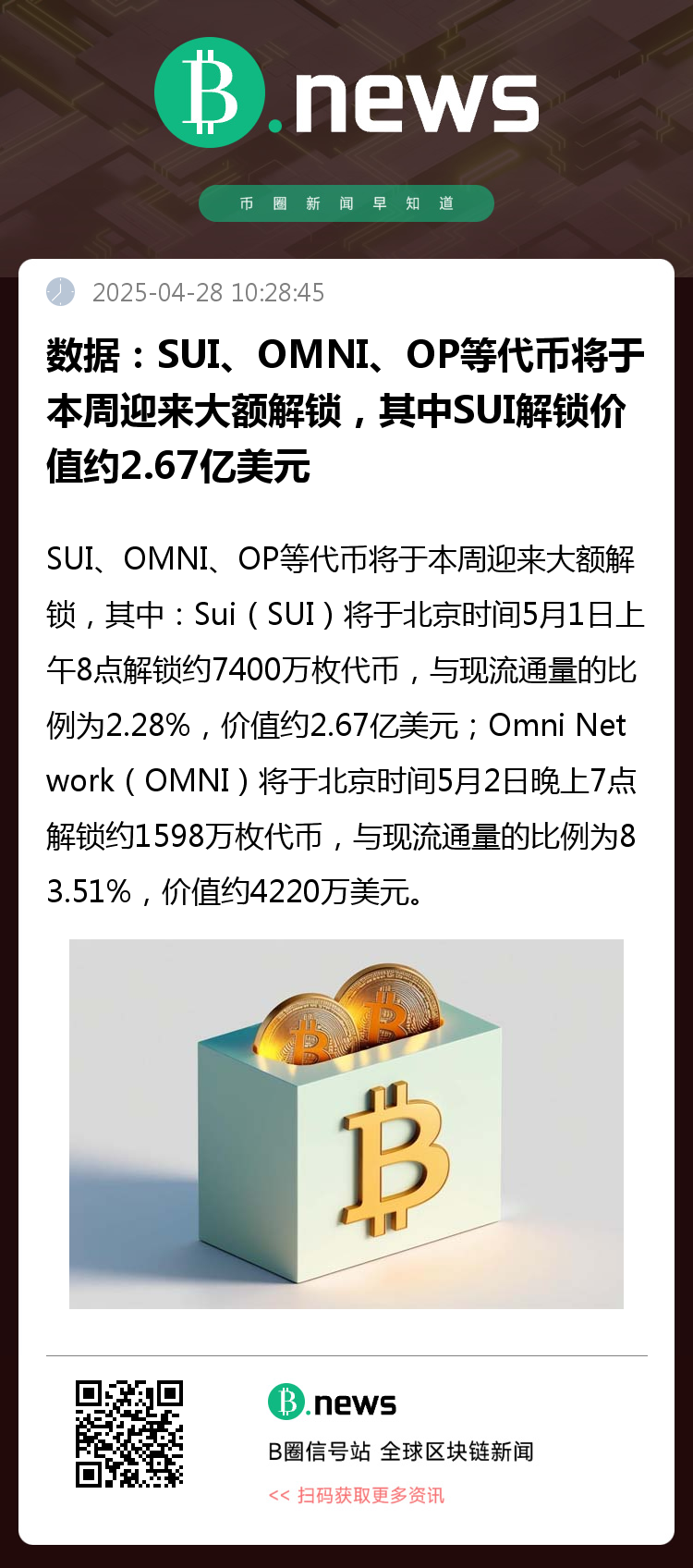 Token Unlocks数据显示,SUI、OMNI、OP等代币将于本周迎来大额解锁,其中: