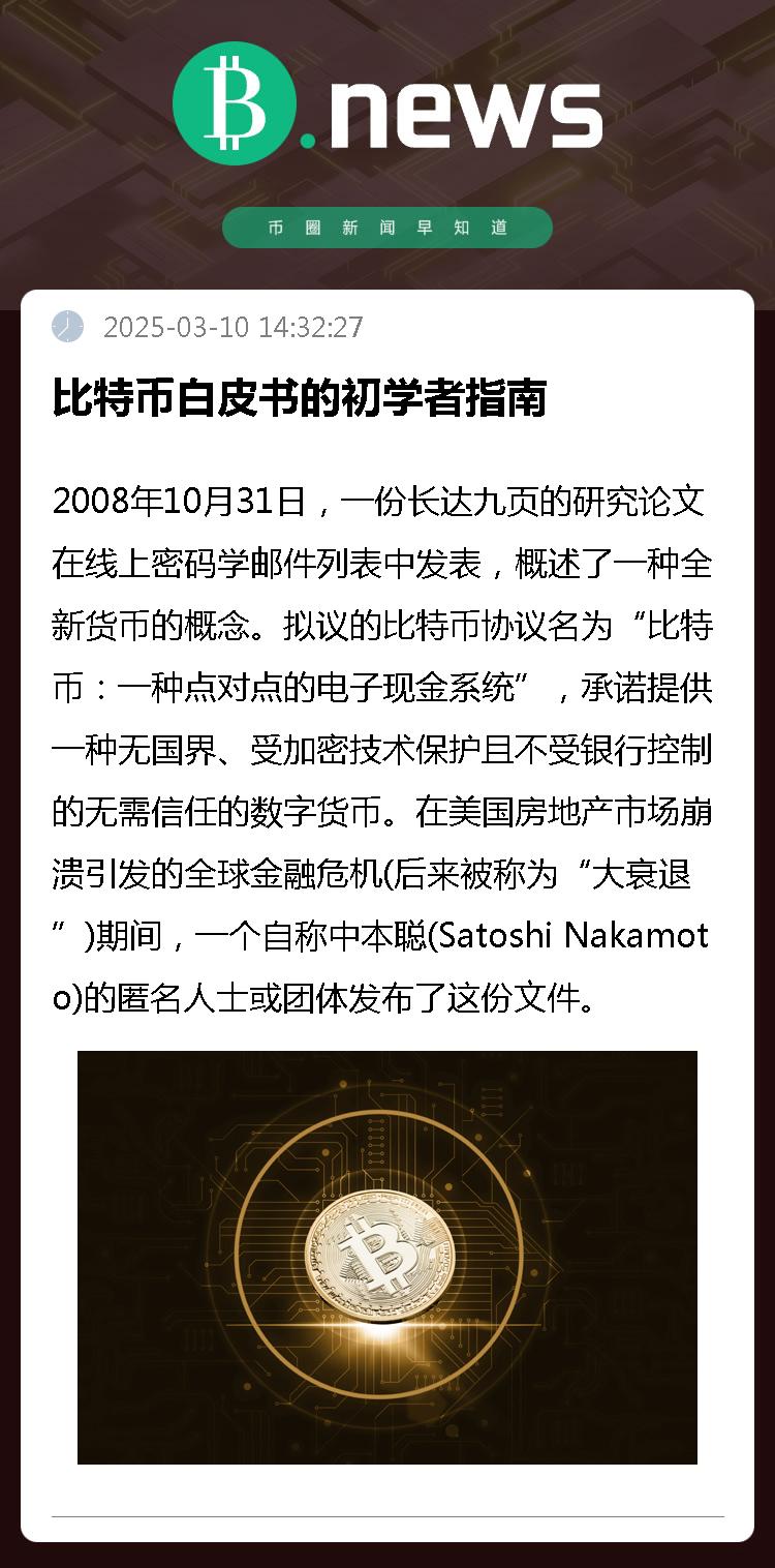 在美国房地产市场崩溃引发的全球金融危机(后来被称为“大衰退”)期间,一个自称中本聪(Satoshi Nakamoto)的匿名人士或团体发布了这份文件。