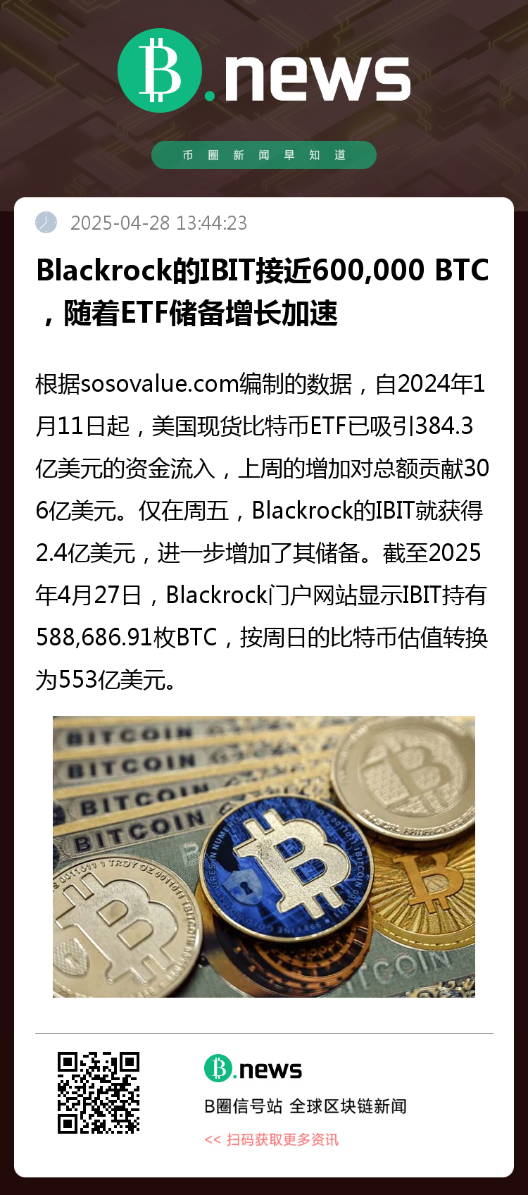 根据sosovalue.com编制的数据,自2024年1月11日起,美国现货比特币ETF已吸引384.3亿美元的资金流入,上周的增加对总额贡献306亿美元。仅在周五,Blackrock的IBIT就获得2.4亿美元,进一步增加了其储备。截至2025年4月27日,Blackrock门户网站显示IBIT持有588,686.91枚BTC,按周日的比特币估值转换为553亿美元。