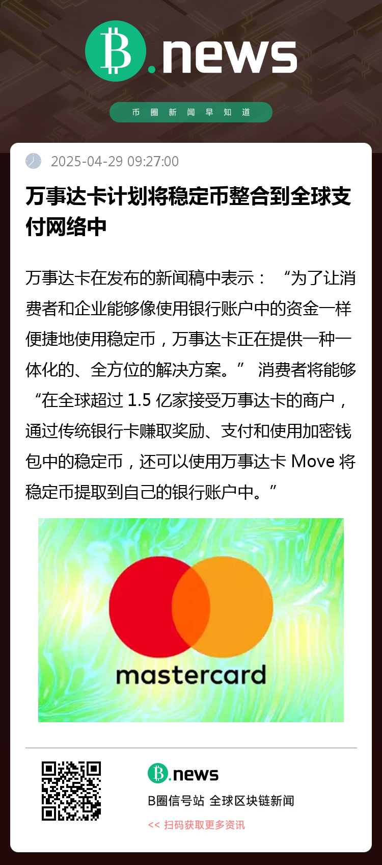 万事达卡正在采取行动,允许消费者使用稳定币消费,允许商家使用稳定币收款。