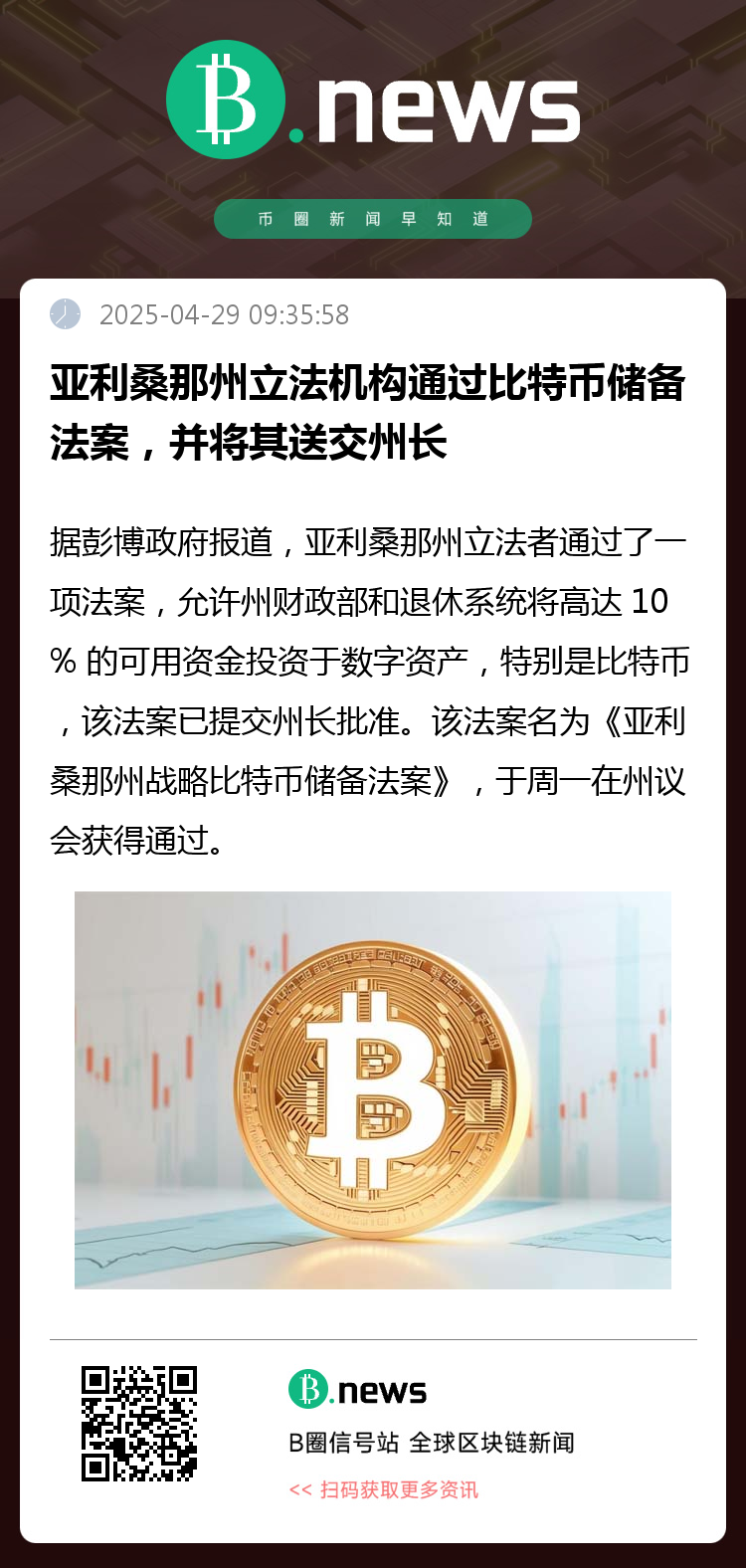据彭博政府报道,亚利桑那州立法者通过了一项法案,允许州财政部和退休系统将高达 10% 的可用资金投资于数字资产,特别是比特币,该法案已提交州长批准。该法案名为《亚利桑那州战略比特币储备法案》,于周一在州议会获得通过。