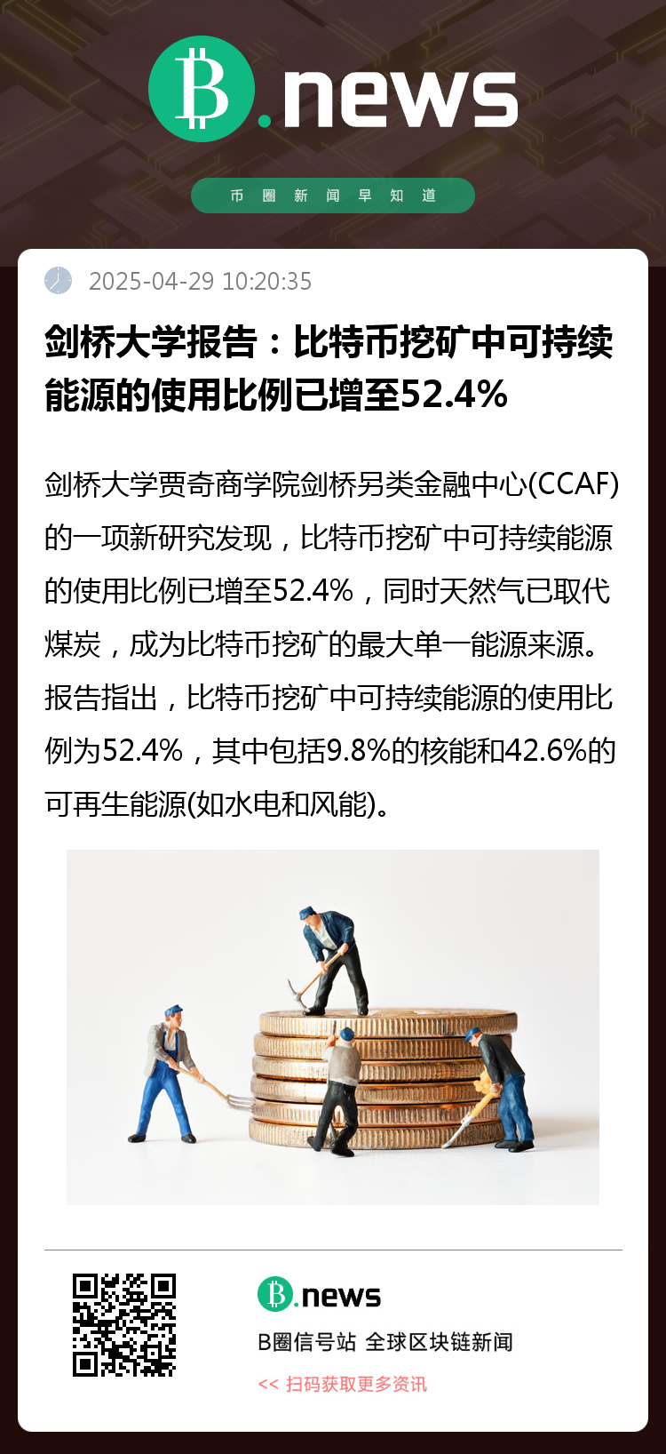 剑桥大学贾奇商学院剑桥另类金融中心(CCAF)的一项新研究发现,比特币挖矿中可持续能源的使用比例已增至52.4%,同时天然气已取代煤炭,成为比特币挖矿的最大单一能源来源。报告指出,比特币挖矿中可持续能源的使用比例为52.4%,其中包括9.8%的核能和42.6%的可再生能源(如水电和风能)。相比之下,2022年可持续能源的总体使用比例估计为37.6%。天然气已成为比特币挖矿的最大单一能源来源,占比38.2%(高于2022年的25.0%),而煤炭的使用比例则降至8.9%(低于2022年的36.6%)。