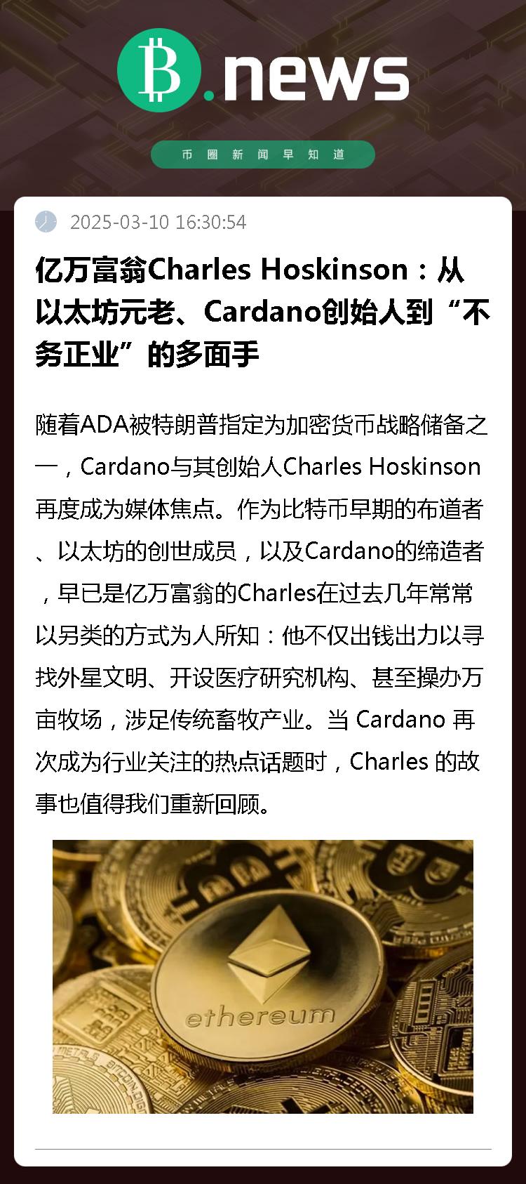 随着ADA被特朗普指定为加密货币战略储备之一,Cardano与其创始人Charles Hoskinson再度成为媒体焦点。作为比特币早期的布道者、以太坊的创世成员,以及Cardano的缔造者,早已是亿万富翁的Charles在过去几年常常以另类的方式为人所知:他不仅出钱出力以寻找外星文明、开设医疗研究机构、甚至操办万亩牧场,涉足传统畜牧产业。当 Cardano 再次成为行业关注的热点话题时,Charles 的故事也值得我们重新回顾。