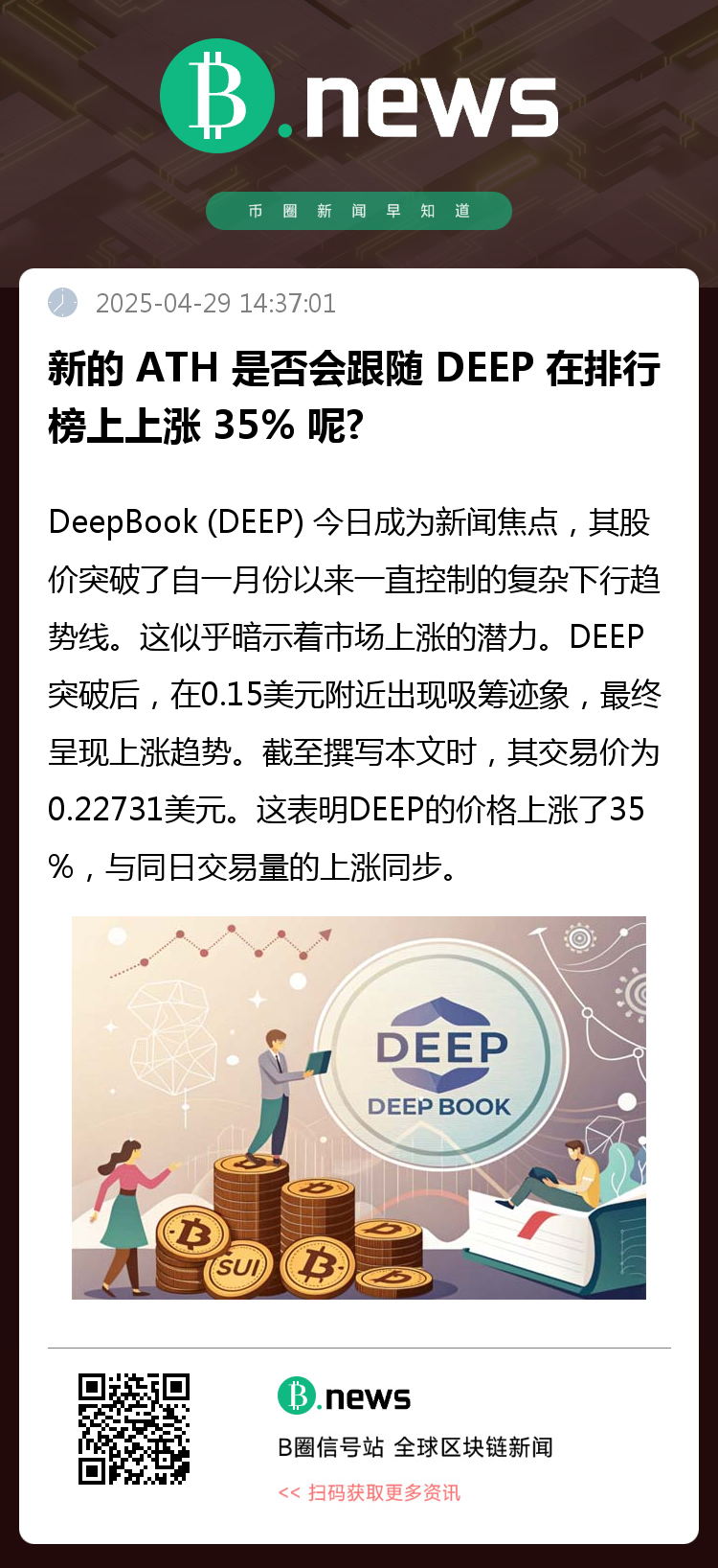 现在,如果 DEEP 的发稿时势头保持强劲,它就有机会重回其之前的历史高点 0.34588 美元。如果价格在持续的看涨阶段突破 0.23 美元,市场可能会加速上涨至 0.34-0.35 美元。