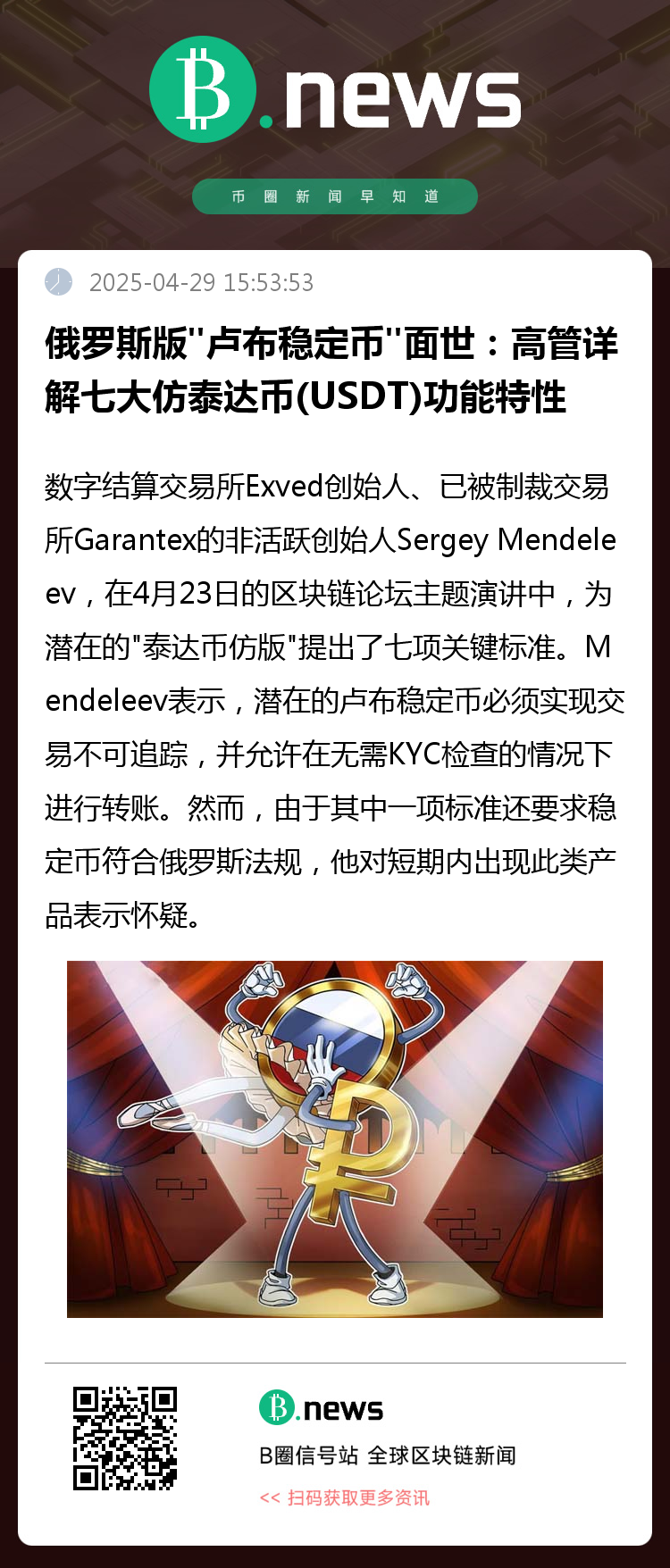 数字结算交易所Exved创始人、已被制裁交易所Garantex的非活跃创始人Sergey Mendeleev,在4月23日的区块链论坛主题演讲中,为潜在的"泰达币仿版"提出了七项关键标准。