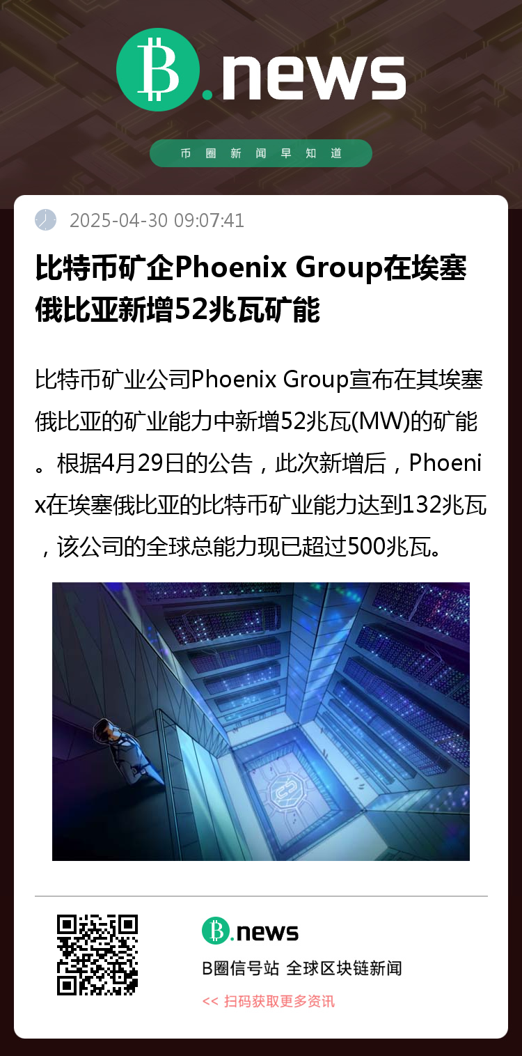 根据4月29日的公告,此次新增后,Phoenix在埃塞俄比亚的比特币矿业能力达到132兆瓦,该公司的全球总能力现已超过500兆瓦。