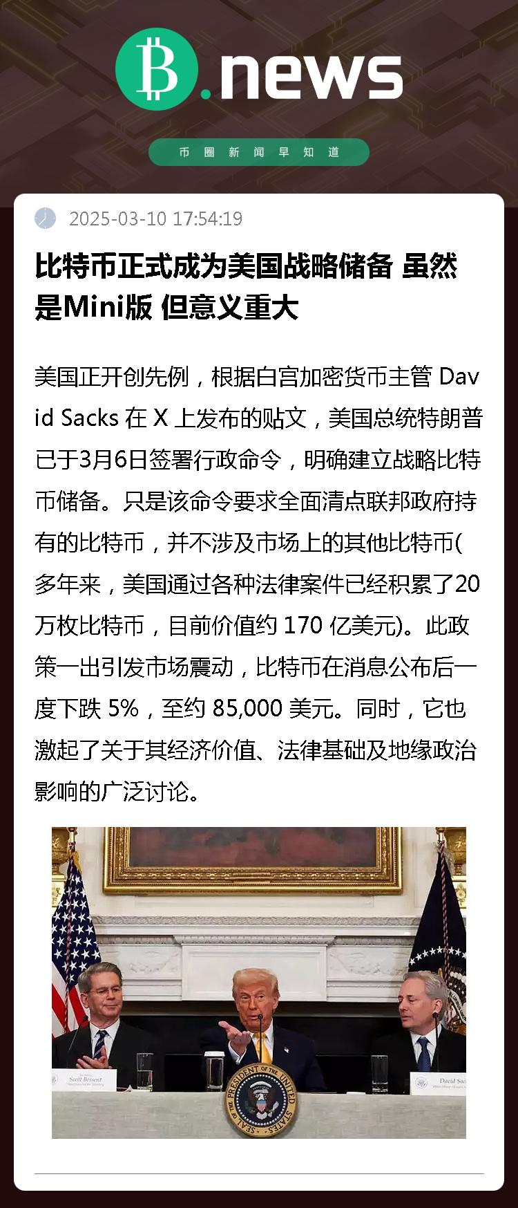 此政策一出引发市场震动,比特币在消息公布后一度下跌 5%,至约 85,000 美元。同时,它也激起了关于其经济价值、法律基础及地缘政治影响的广泛讨论。