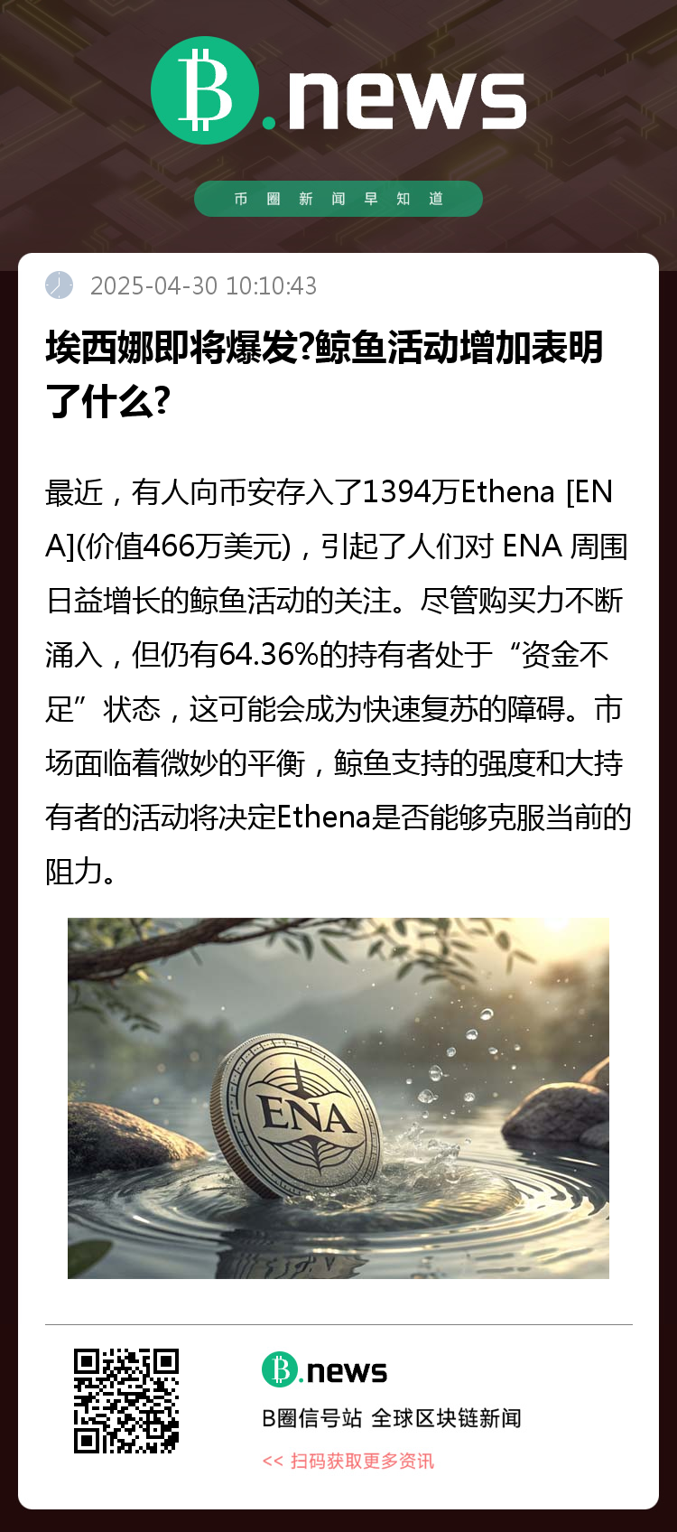 最近,有人向币安存入了 1394 万Ethena [ENA](价值 466 万美元),引起了人们对 ENA 周围日益增长的鲸鱼活动的关注。