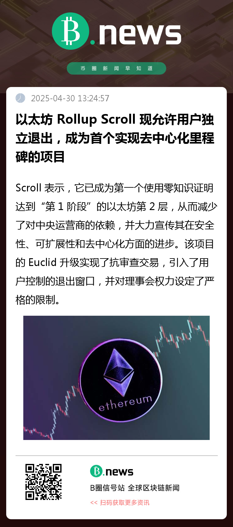 本月早些时候,用户投票通过了Scroll 的 Euclid 升级,即使主运营商停止或试图阻止用户操作,该系统也能保持运行。