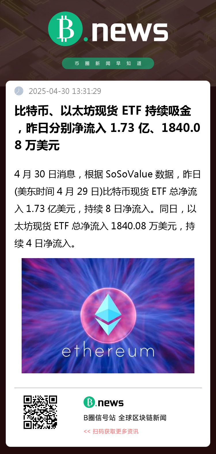 4 月 30 日消息,根据 SoSoValue 数据,昨日(美东时间 4 月 29 日)比特币现货 ETF 总净流入 1.73 亿美元,持续 8 日净流入。