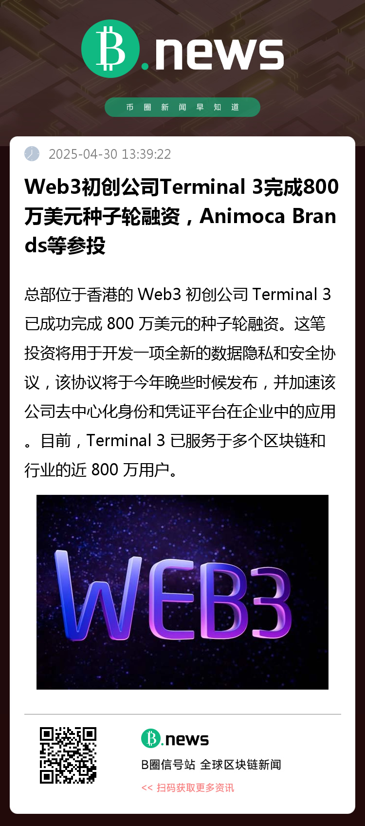 香港--(BUSINESS WIRE)--总部位于香港的 Web3 初创公司 Terminal 3 已成功完成 800 万美元的种子轮融资。这笔投资将用于开发一项全新的数据隐私和安全协议,该协议将于今年晚些时候发布,并加速该公司去中心化身份和凭证平台在企业中的应用。目前,Terminal 3 已服务于多个区块链和行业的近 800 万用户。