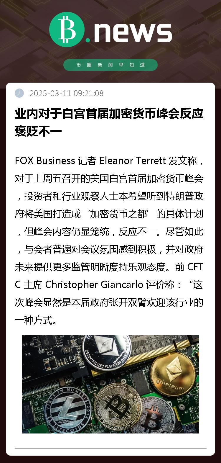 ChainCatcher 消息,FOX Business 记者 Eleanor Terrett 发文称,对于上周五召开的美国白宫首届加密货币峰会,投资者和行业观察人士本希望听到特朗普政府将美国打造成‘加密货币之都’的具体计划,但峰会内容仍显笼统,反应不一。