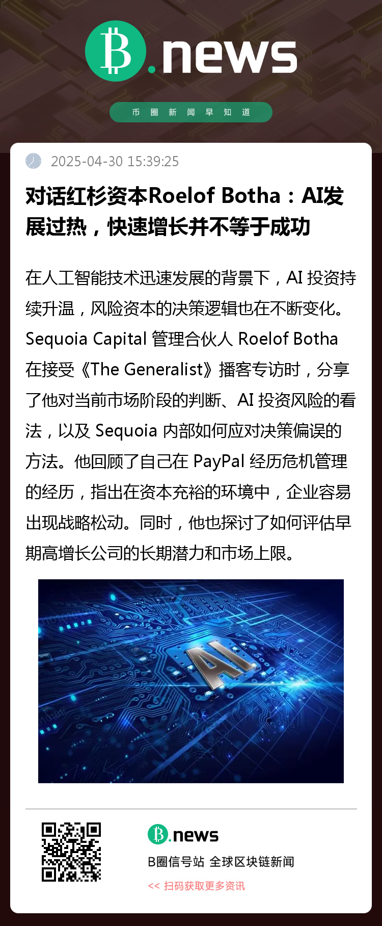 在人工智能技术迅速发展的背景下,AI 投资持续升温,风险资本的决策逻辑也在不断变化。Sequoia Capital 管理合伙人 Roelof Botha 在接受《The Generalist》播客专访时,分享了他对当前市场阶段的判断、AI 投资风险的看法,以及 Sequoia 内部如何应对决策偏误的方法。