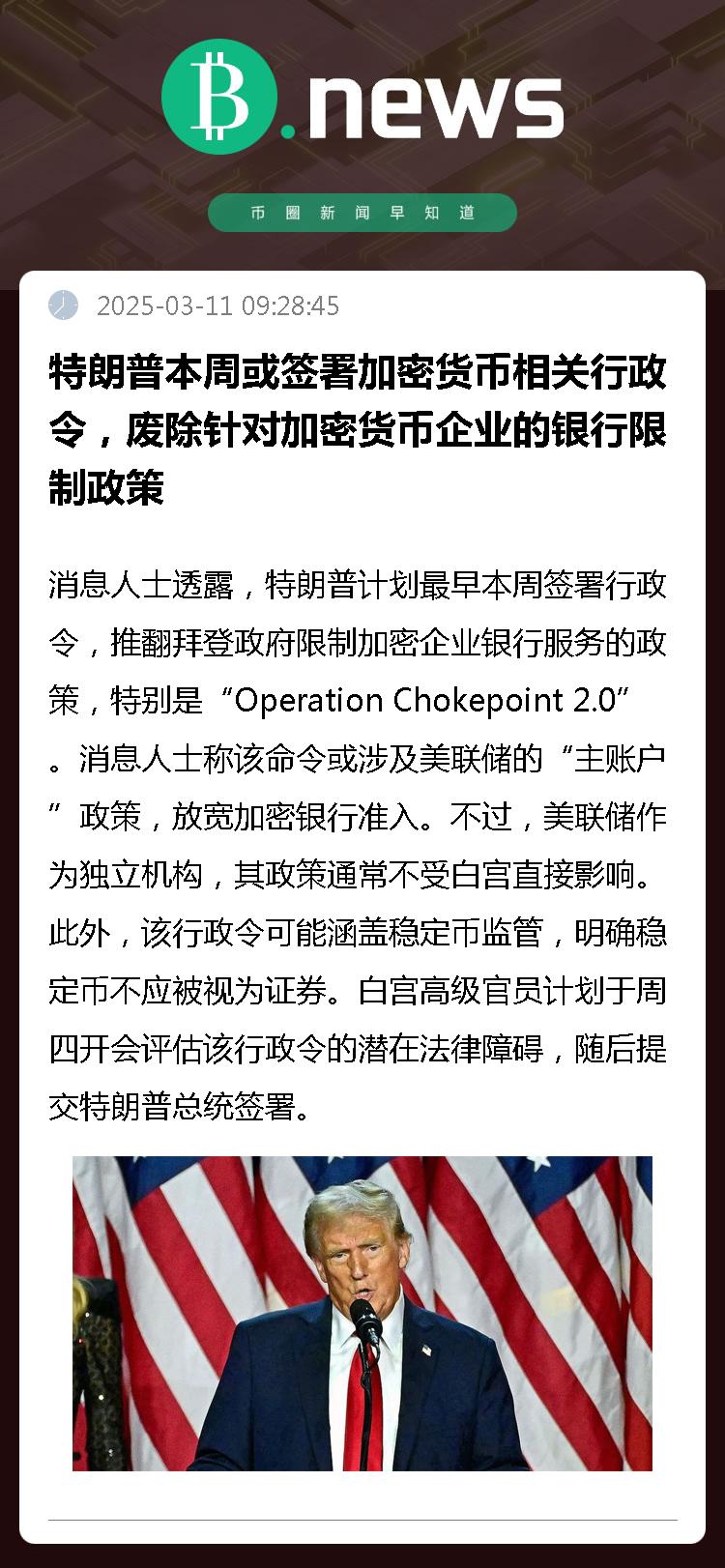 消息人士透露,特朗普计划最早本周签署行政令,推翻拜登政府限制加密企业银行服务的政策,特别是“Operation Chokepoint 2.0”。