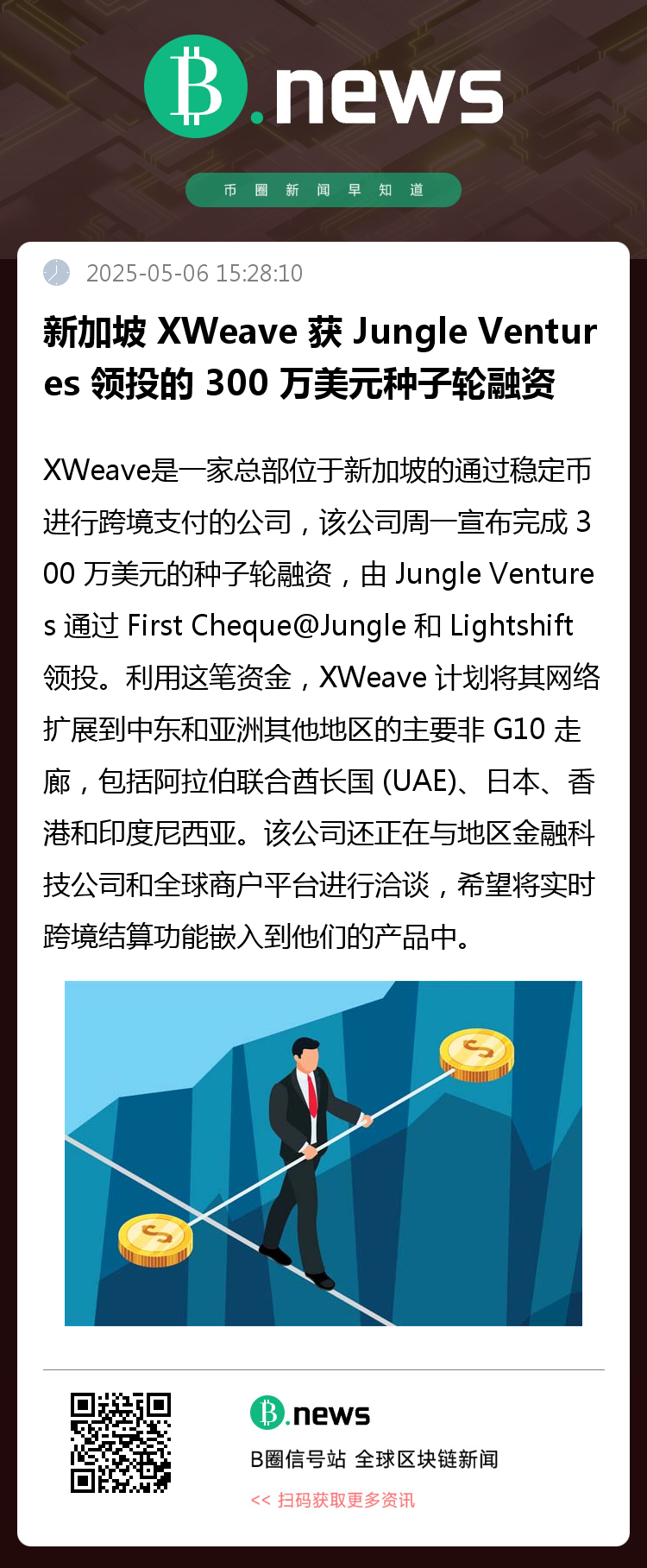 XWeave是一家总部位于新加坡的通过稳定币进行跨境支付的公司,该公司周一宣布完成 300 万美元的种子轮融资,由 Jungle Ventures 通过 First Cheque@Jungle 和 Lightshift 领投。