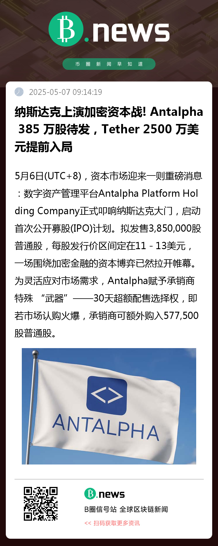 5 月 6 日(UTC+8),资本市场迎来一则重磅消息:数字资产管理平台 Antalpha Platform Holding Company 正式叩响纳斯达克大门,启动首次公开募股(IPO)计划。公司拟发售 3,850,000 股普通股,每股发行价区间定在 11 - 13 美元,一场围绕加密金融的资本博弈已然拉开帷幕。