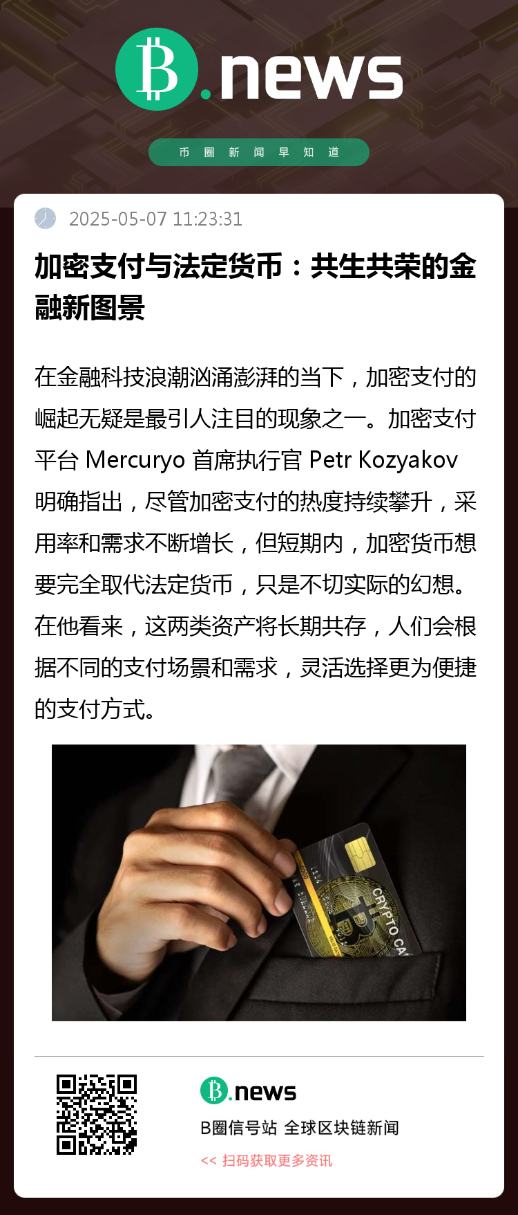 在金融科技浪潮汹涌澎湃的当下,加密支付的崛起无疑是最引人注目的现象之一。然而,加密支付平台 Mercuryo 首席执行官 Petr Kozyakov 却有着独到的见解,他认为金融的未来并非是 “赢家通吃” 的残酷竞争,而是数字资产与法定货币携手同行,在各自擅长的领域绽放光彩。